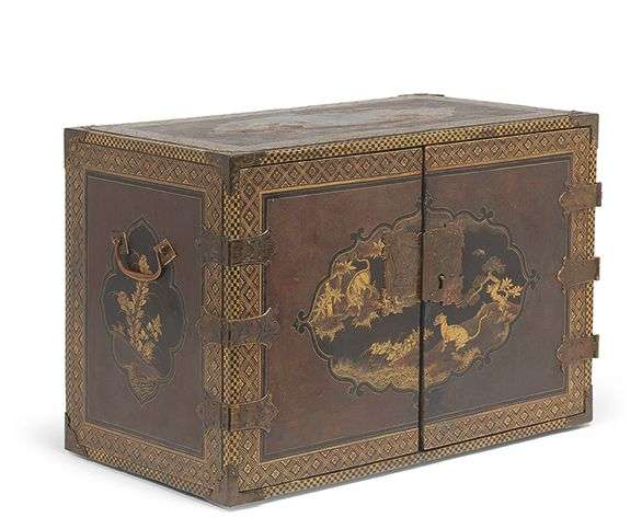 De forme rectangulaire, à deux portes ouvrant sur neuf tiroirs ornés de fleurs et paon, les différentes faces décorées de réserves polylobées abritant des compositions florales et deux tigres en façade. L'ensemble souligné par des bandes de résilles de sapèques. Le décor laqué est complété par d'imposantes ferrures ouvragées en cuivre doré à décor de rinceaux et vrilles. Avec sa clef.