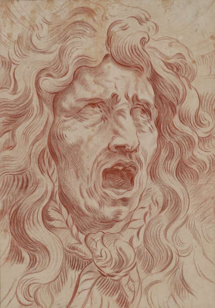 Expression head with a screaming man, red chalk