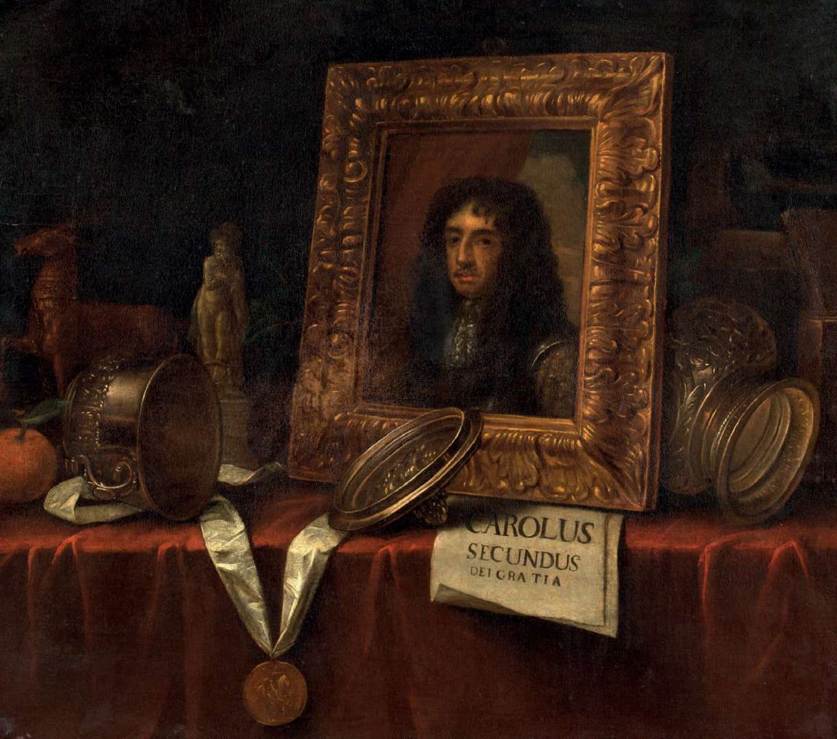 Portrait of Charles II (1630-1685) and pieces of silverware on an entablature, canvas