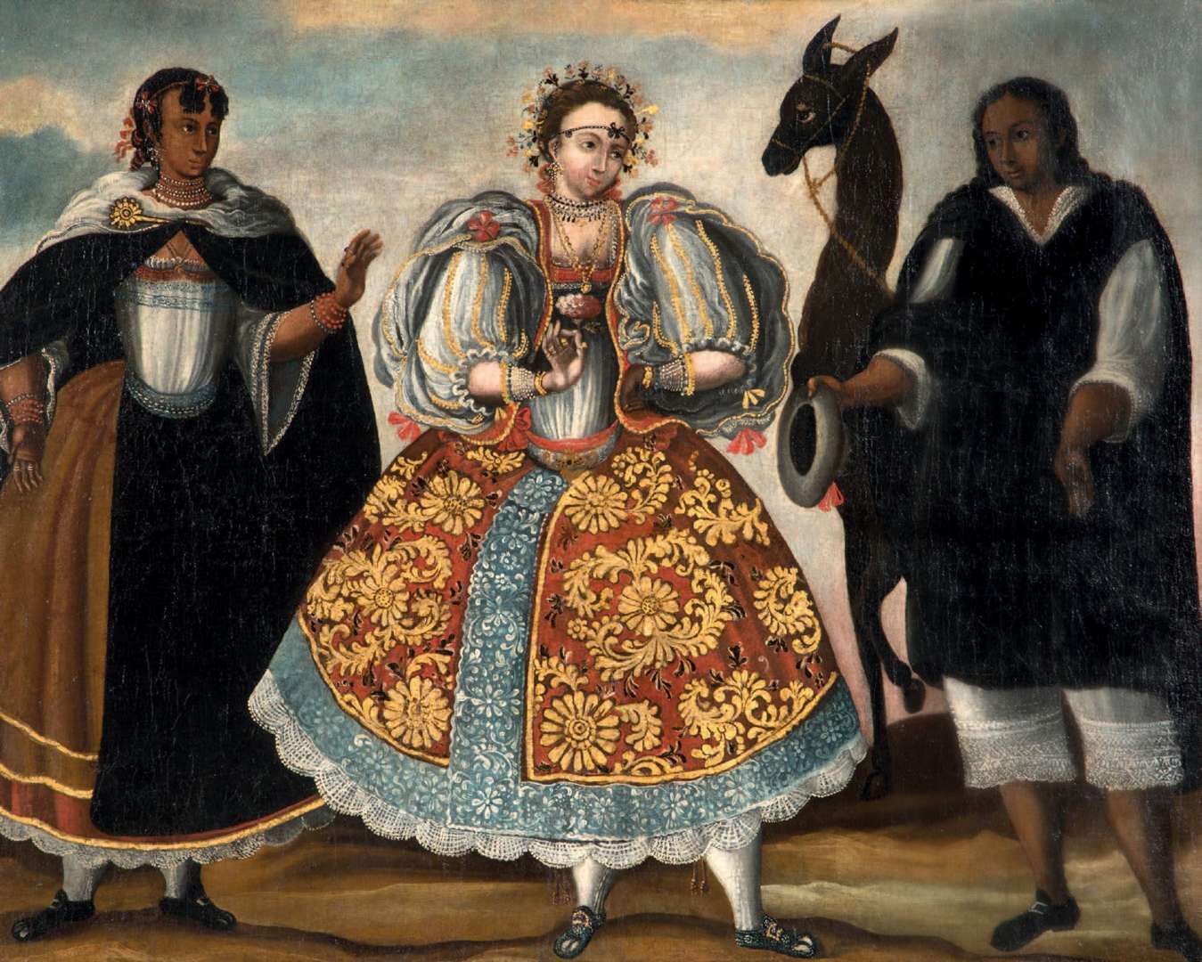 femme blanche, accompagnée de part et d’autre par deux Indiens. La peau pâle, très richement vêtue, tenant à la main une rose de Castille, celle que l’on peut identifier comme une femme noble en raison de sa luxueuse apparence, semble recevoir par sa gestuelle, les requêtes de l’homme venu se présenter à elle. Le lama accompagnant ce dernier l’identifie comme muletier tandis que les vêtements bordés de dentelle en-dessous de son habit noir, laissent entendre qu’il a porté un soin particulier à sa tenue. Cette attention fait écho au choix vestimentaire de l’autre femme à gauche, qui malgré un ensemble plus sobre que sa comparse, arbore divers bijoux dont une broche – un tupu (bijou inca) –, des parures dans ses cheveux, autour de ses poignets ainsi que de la dentelle, elle aussi.