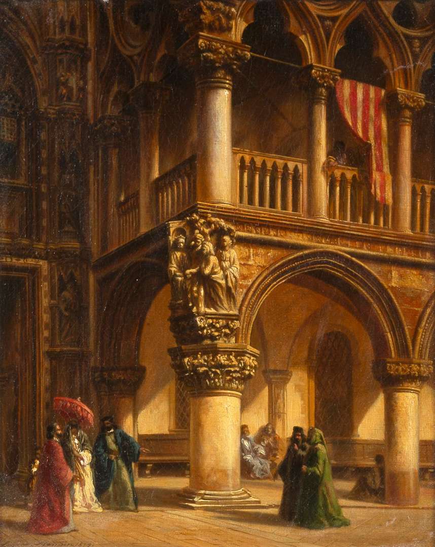 Interior of the Doge's Palace in Venice, oil on canvas, signed lower left
