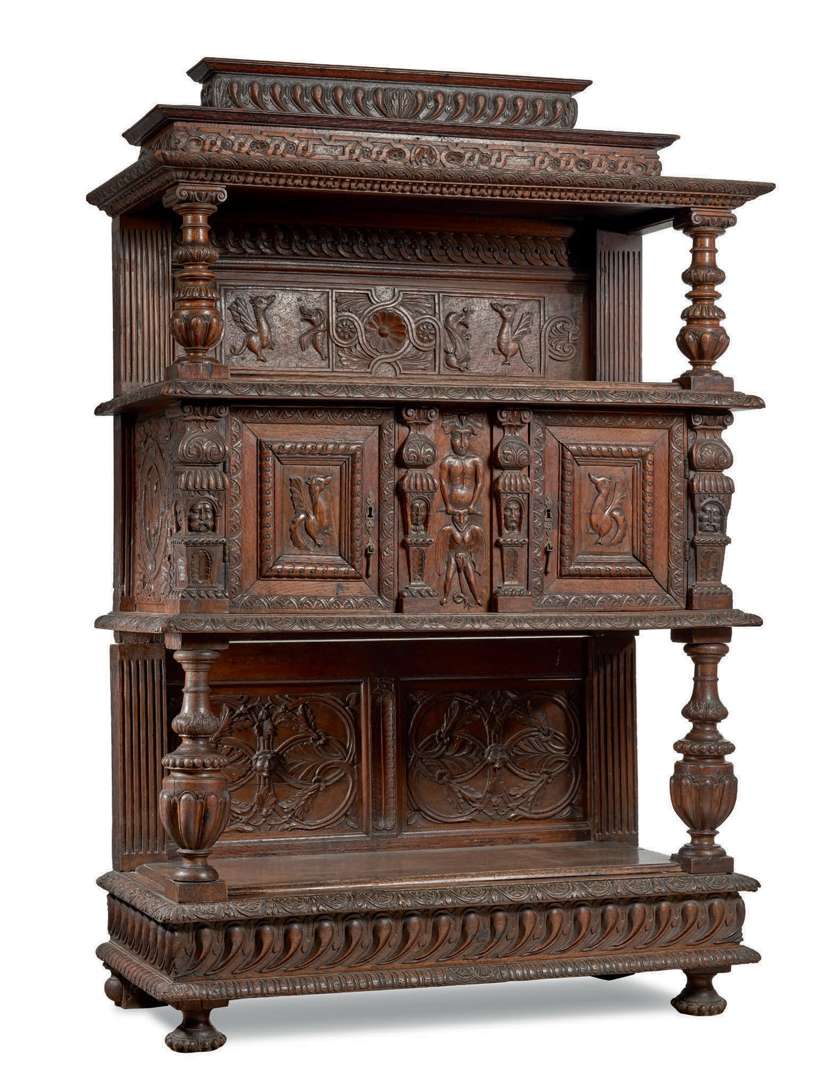 La partie basse à deux pilliers sculptés, godrons et pieds antérieurs ouvragés.