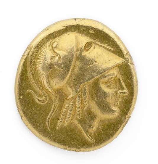 Tête casquée d'Athéna à droite, coiffée du casque corinthien à aigrette orné d'un serpent, quatre mèches de cheveux torsadées et séparées.