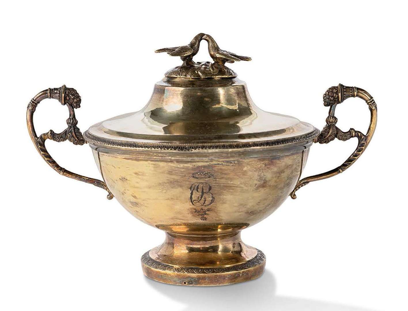 en vermeil reposant sur un piédouche circulaire à palmettes, anses en forme de corne d'abondance, bouillon couvert à prise en couple de pigeons.