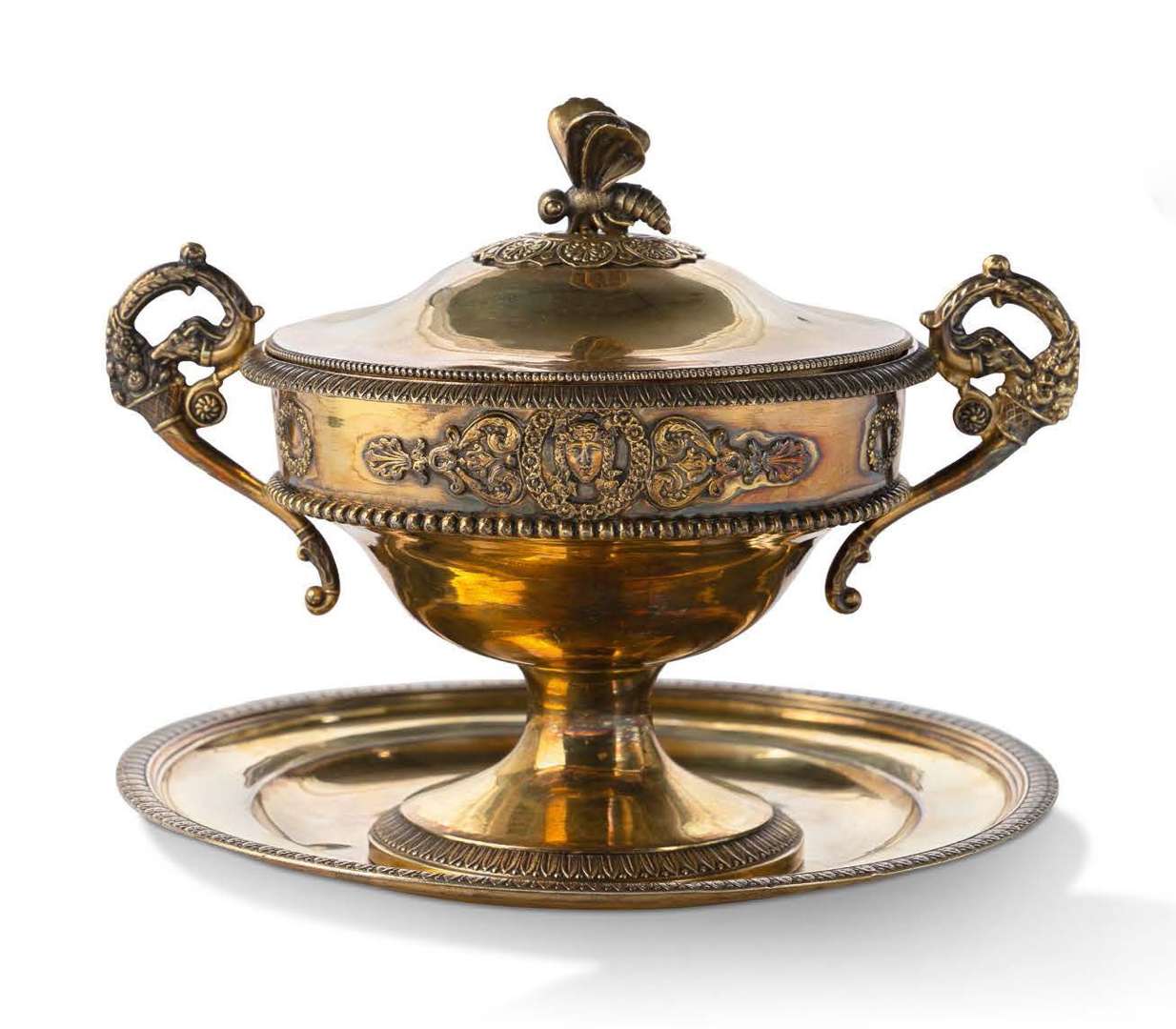 en vermeil reposant sur un piédouche circulaire à feuilles d'eau, anses en forme de corne d'abondance à tête de chèvre, bouillon couvert à prise en papillon.