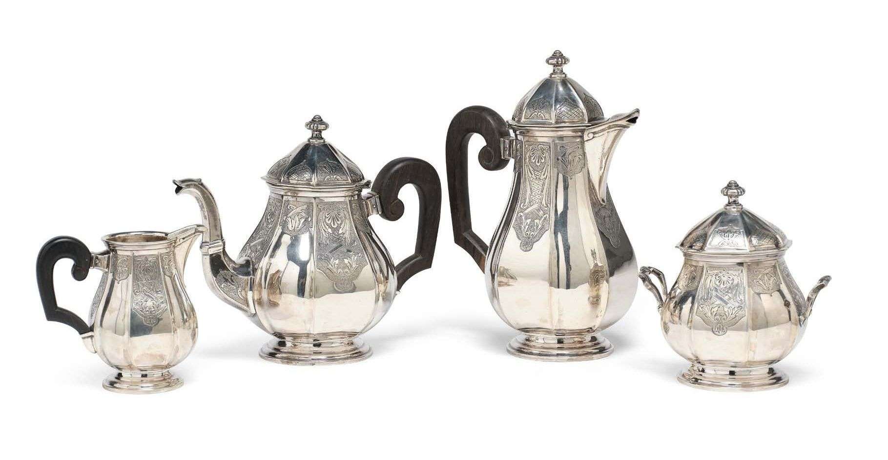 en argent. Les panses à décor de lambrequins et les manches en bois noirci.
