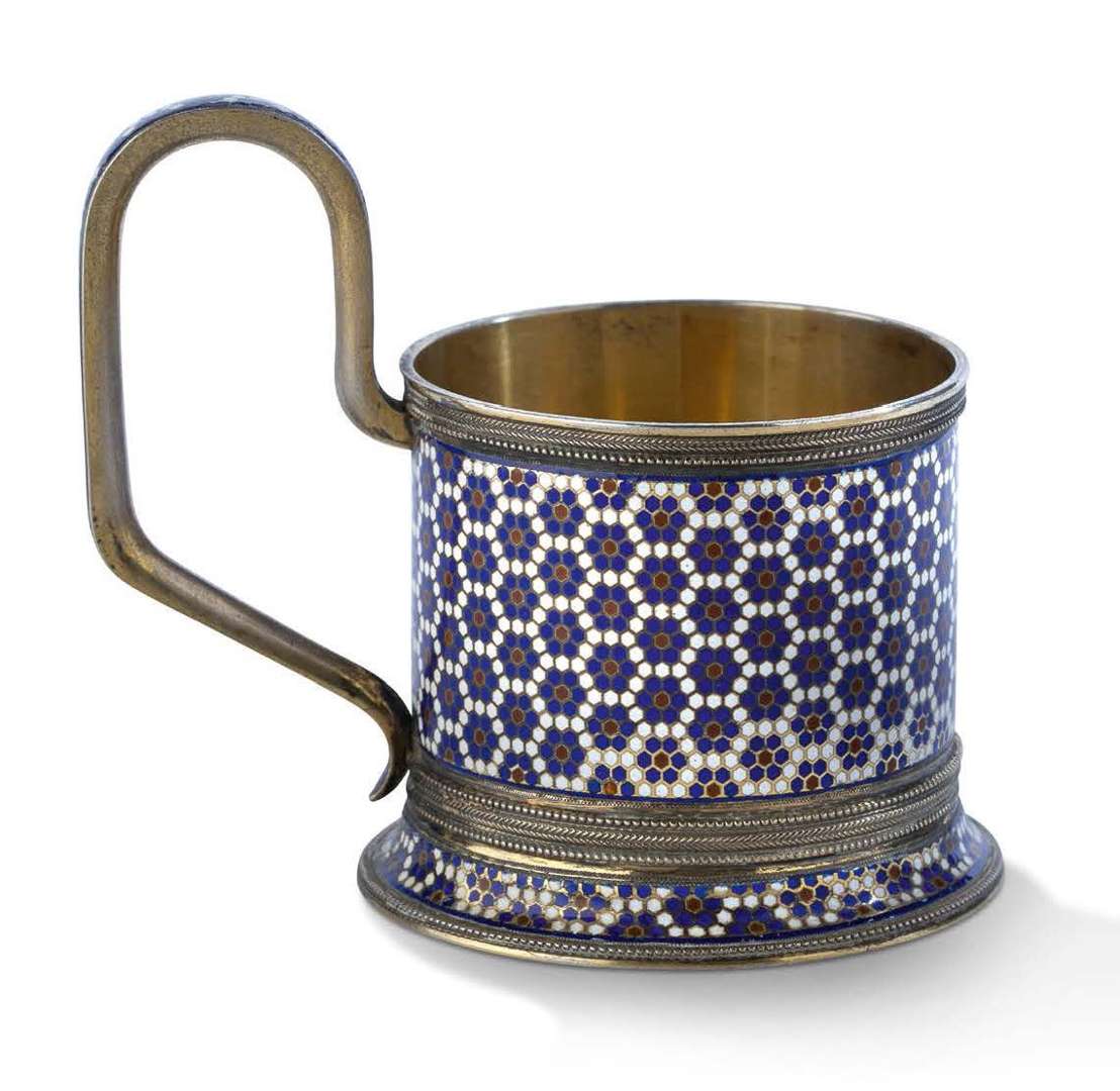 en argent vermeillé 84 zolotniks (875 millièmes) à décor émaillé bleu, blanc, rouge champlevé, à motif de nids d'abeilles.
