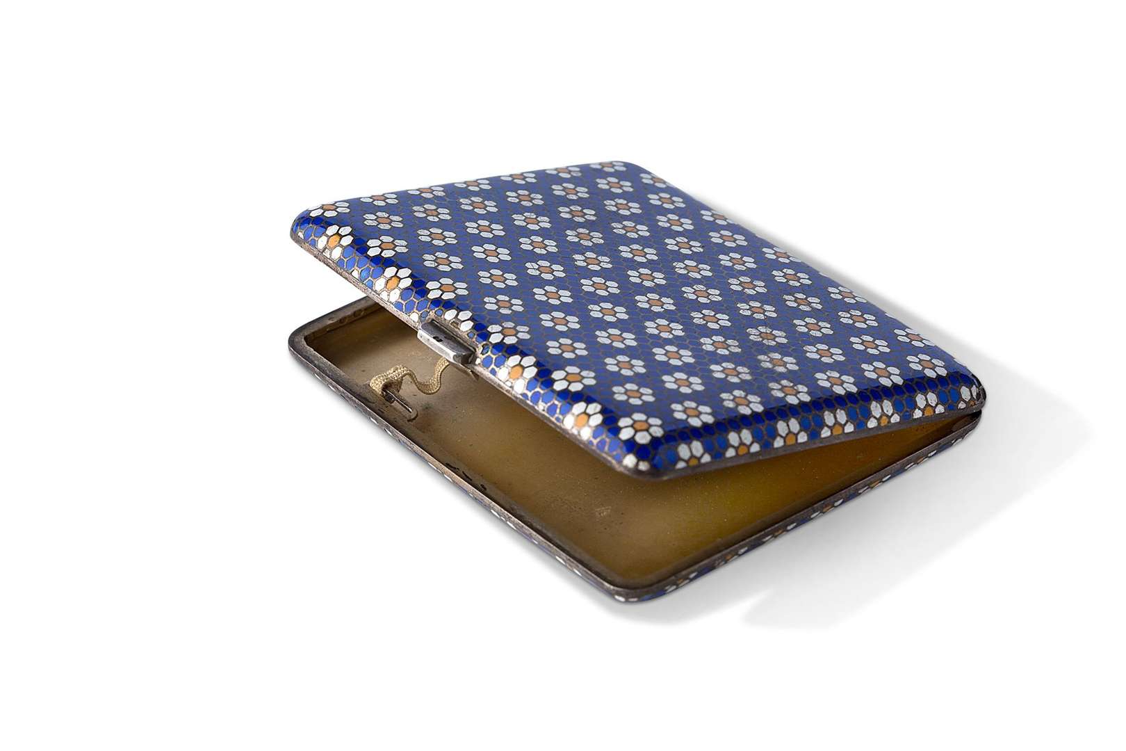 en argent vermeillé à décor émaillé bleu, blanc, jaune, à motif de nids d'abeilles.