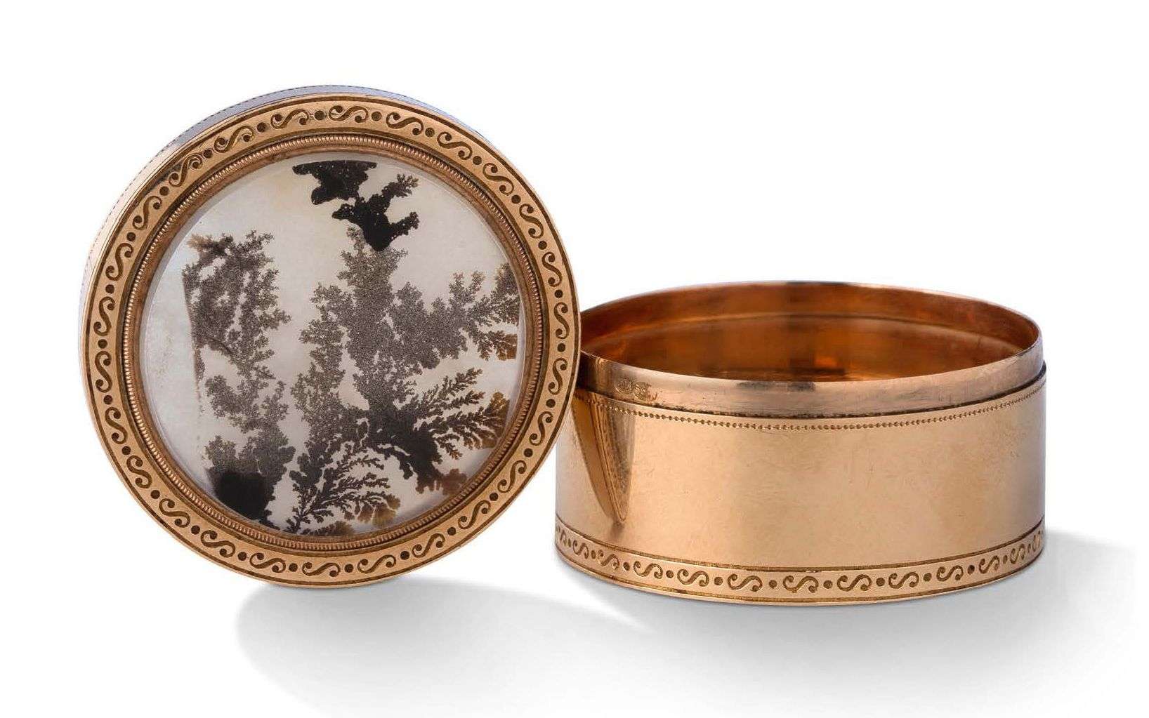 Boîte de forme circulaire en or jaune à décor de frises et filets gravés, le couvercle est orné d'une agate dendritique.