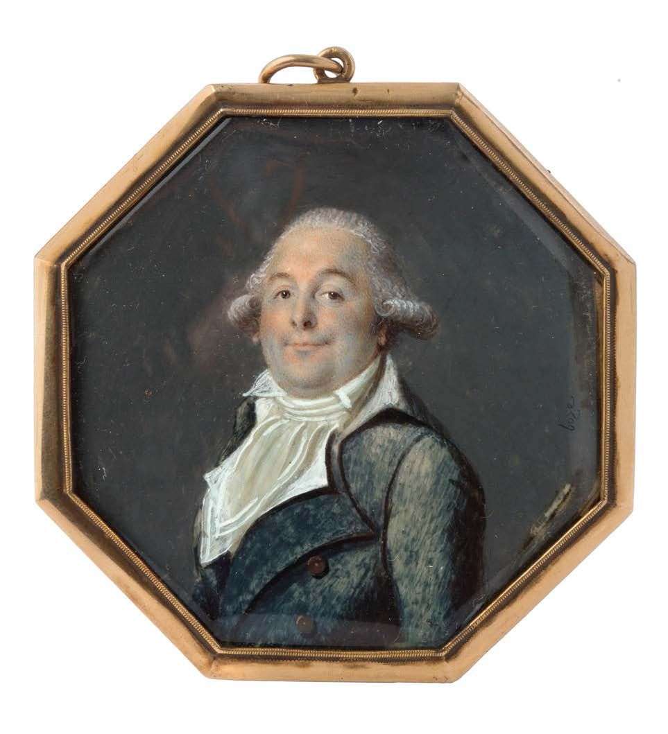 ˜ Portrait en miniature sur ivoire de forme octogonale peint à la gouache sur ivoire représentant un homme en redingote bleue.