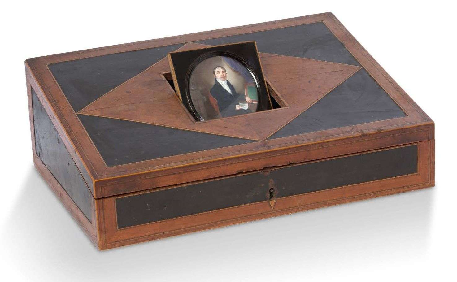 en bois de placage. Le couvercle supérieur en pente est orné d'un portrait en miniature ovale reversible représentant