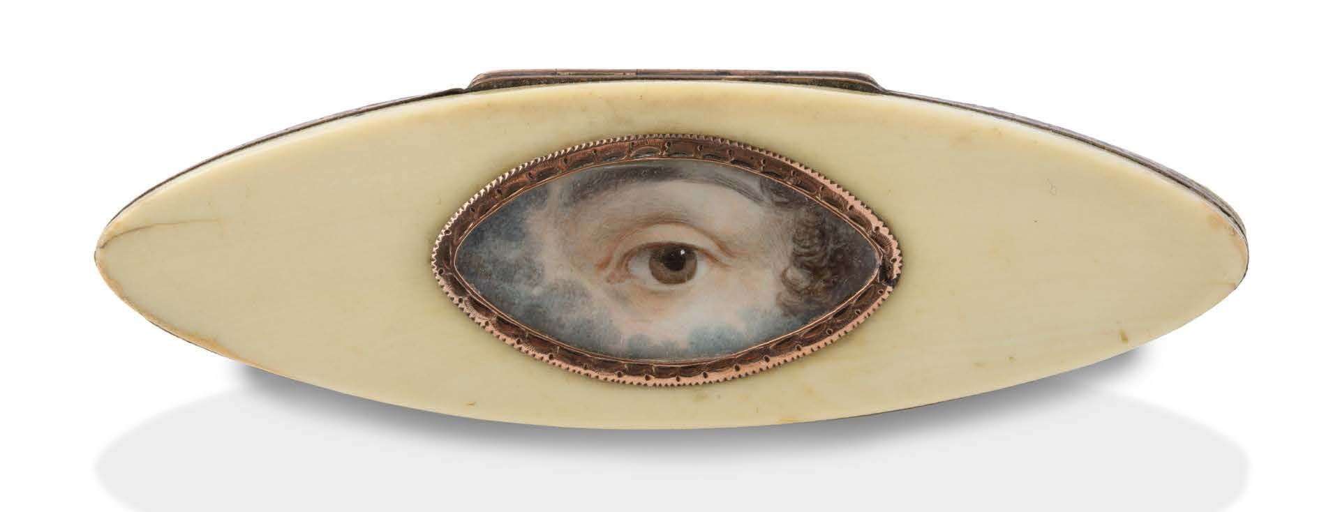 Les miniatures d'oeil sont hautement symboliques et représentent l'oeil de l'être aimé et aimant. Ces miniatures ont été en vogue en Angleterre depuis le dernier tiers du XVIIIe siècle jusqu'aux années 1840. Engelhert, Richmond ou Cosway sont les miniaturistes généralement associés à ce genre. L'usage considère que lorsque l'oeil émerge d'un nuage - comme sur notre boîte - il s'agit du regard d'un être aimé disparu...
