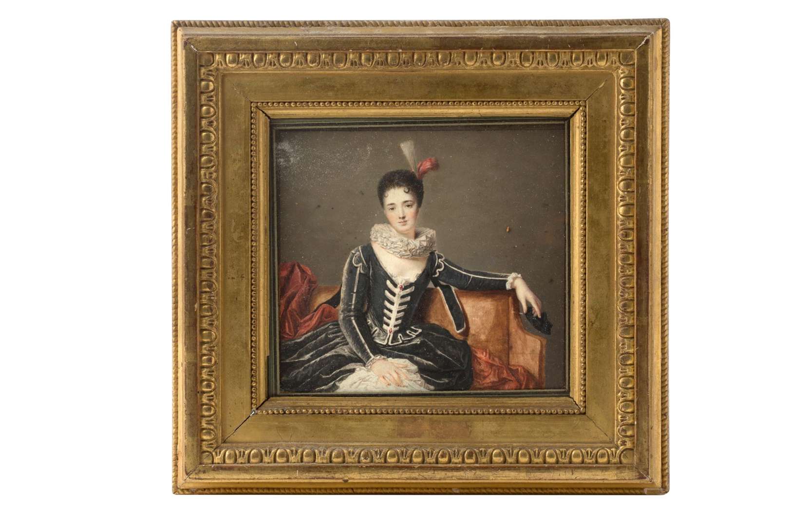 Grande miniature au portrait de femme vêtue à l'espagnole. Gouache sur papier.