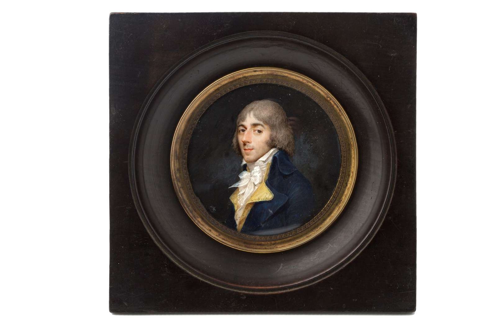 de forme circulaire représentant un homme en buste de 3/4 vêtu d'une redingote bleue et d'une veste jaune, les cheveux mi-longs détachés.