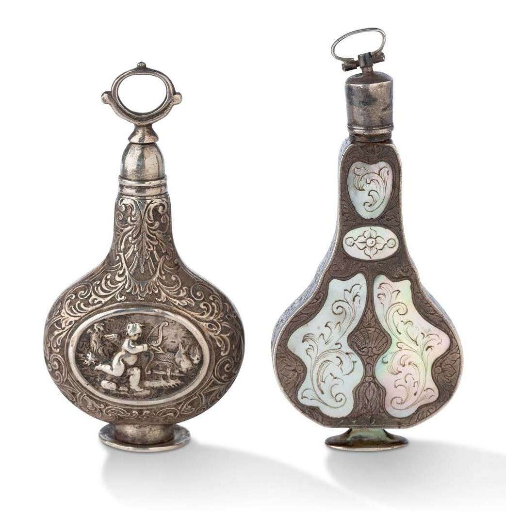 L'autre incrusté de nacre gravée. Bouchon à vis et bélière amovible. XVIIIe siècle.
