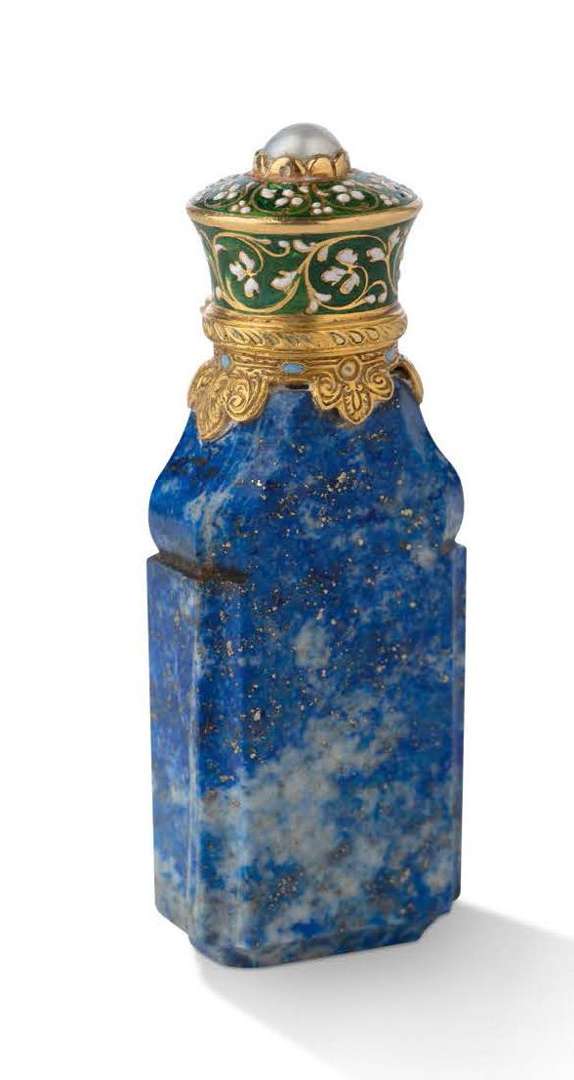 en lapis-lazuli taillé à quatre côtés plats, les arrêtes gorge creuse. Le précieux bouchon en à charnière en or jaune à décor émaillé polychrome de rinceaux fleuris sommé d'une perle sertie. Complet de son bouchon de liège monté en or.
