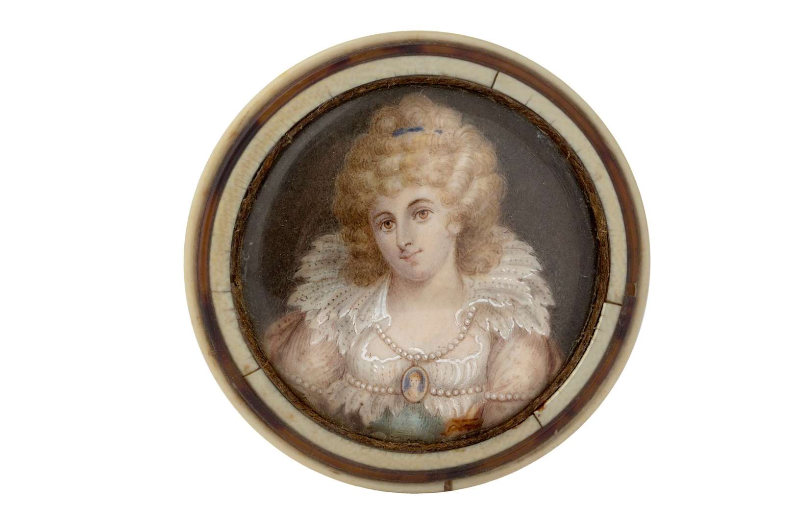Le couvercle orné d'une miniature au portrait en buste d'une dame à la mode de la Renaissance.