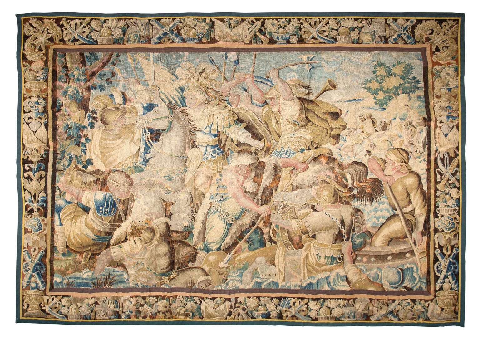 Alexandre le Grand, représenté au premier plan sur la gauche sur son cheval Bucéphale, remporte la victoire contre les Satrapes Perses qui lui ouvre les portes de l'Asie. Bordure à attributs de guerres dont cuirasses, canons, épées, trompettes, fanions, entourés de corbeilles de fruits et composition de fleurs enrubannées.