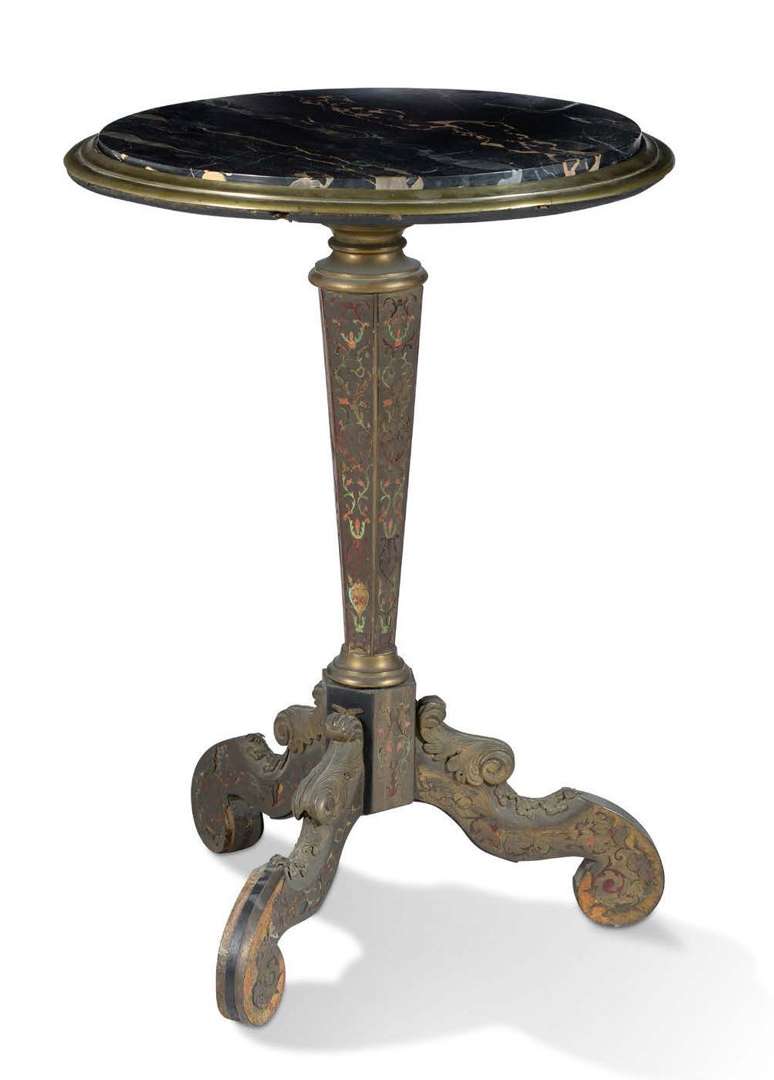 en marqueterie de laiton et incrustation colorées | le fût en gaine hexagonale reposant sur trois pieds en volutes. Dessus circulaire de marbre portor à lingotière. Composé avec des éléments anciens.