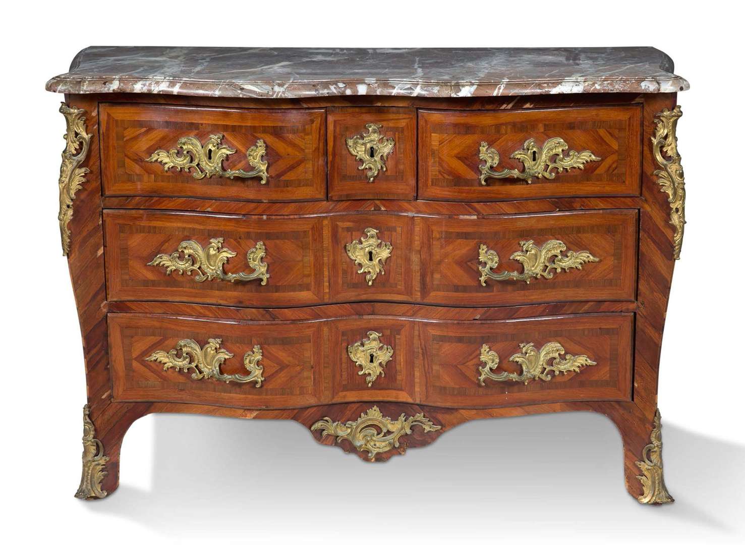 en bois de placage précieux sur bâti de résineux et de chêne. Elle ouvre à cinq tiroirs sur trois rangs. Belle garniture de bronze doré et finement ciselé aux entrées de serrures, poignées et chutes de bronzes.