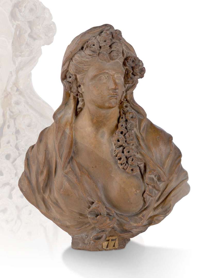 en terre cuite représentant une jeune femme nue, drapée sous un voile, le sein apparent, des fleurs dans la chevelure.