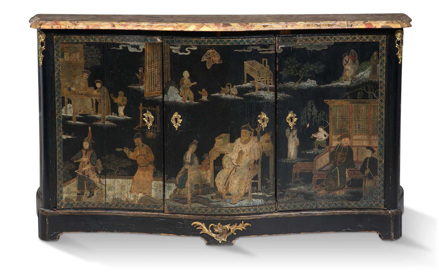 laqué à décor chinois de personnages polychrome sur fond noir. La bâti de résineux, chêne et noyer pour les vantaux. La façade légèrement mouvementée ouvrant à trois vantaux. Bronzes dorés.