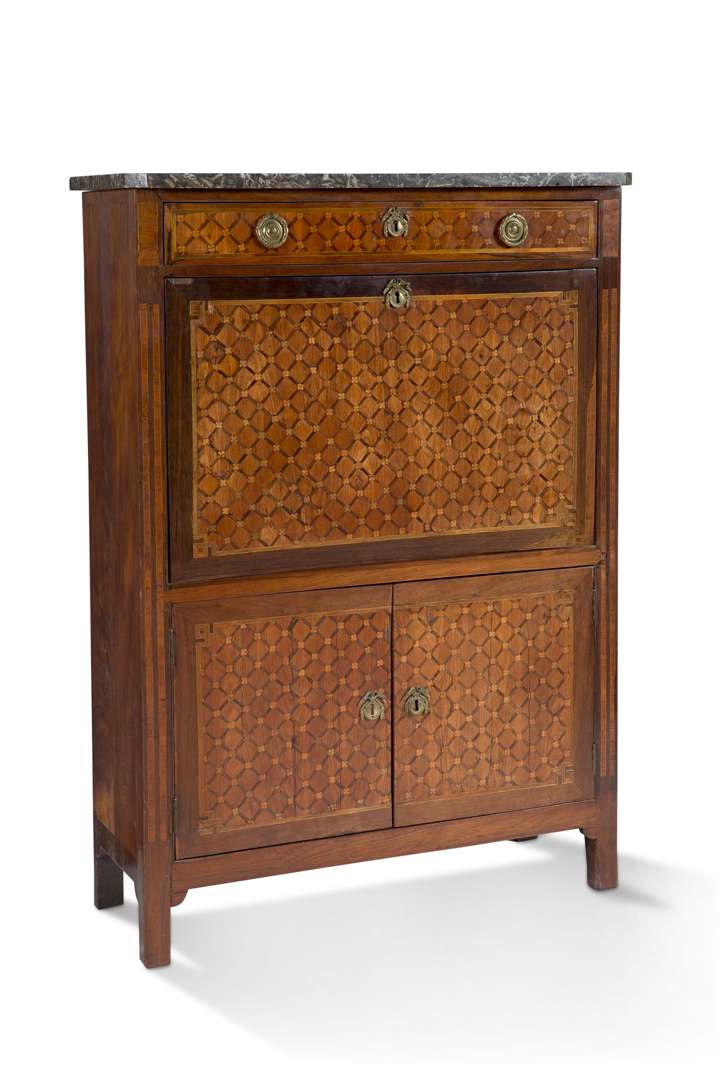 marqueté à décor de croisillon à quartefeuilles, un tiroir supérieur, l'abattant dévoile des rangements et six petits tiroirs.