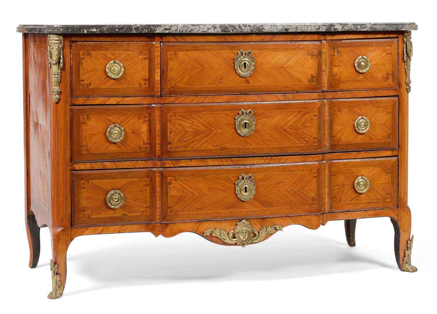 marquetée à ressaut ouvrant à cinq tiroirs sur trois rangs. Pieds antérieurs terminés en pattes de lions. Elle est coiffée d'un marbre gris Saint Anne.