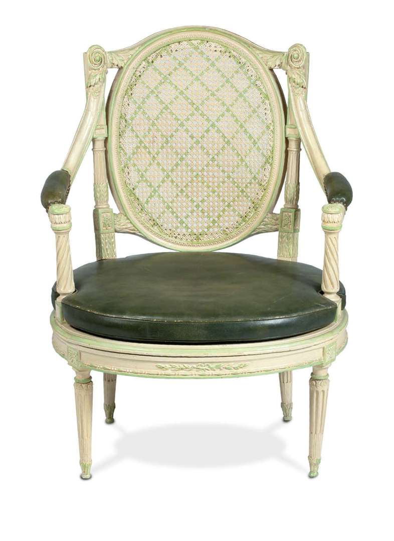 en bois sculpté relaqué crème et rechampis vert entièrement canné. Le dossier à médaillon est pris entre deux montants colonnes terminés par d'amples roquillards dont sont issus les accotoirs à manchette reposant sur des montants à cannelures torses. Il repose sur quatre pieds cannelés et rudentés.