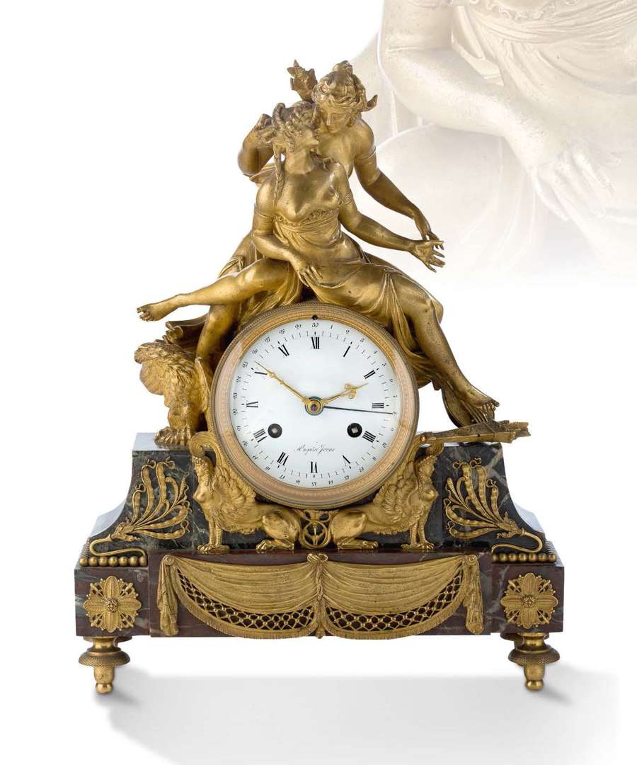 en bronze ciselé et doré. La base en marbre rouge et vert est ornée de sphinges, palmettes et draperies en appliques et est sommée d'un aigle. Le cadran émaillé blanc indiquant les heures en chiffres romains et les minutes en chiffres arabes est signé