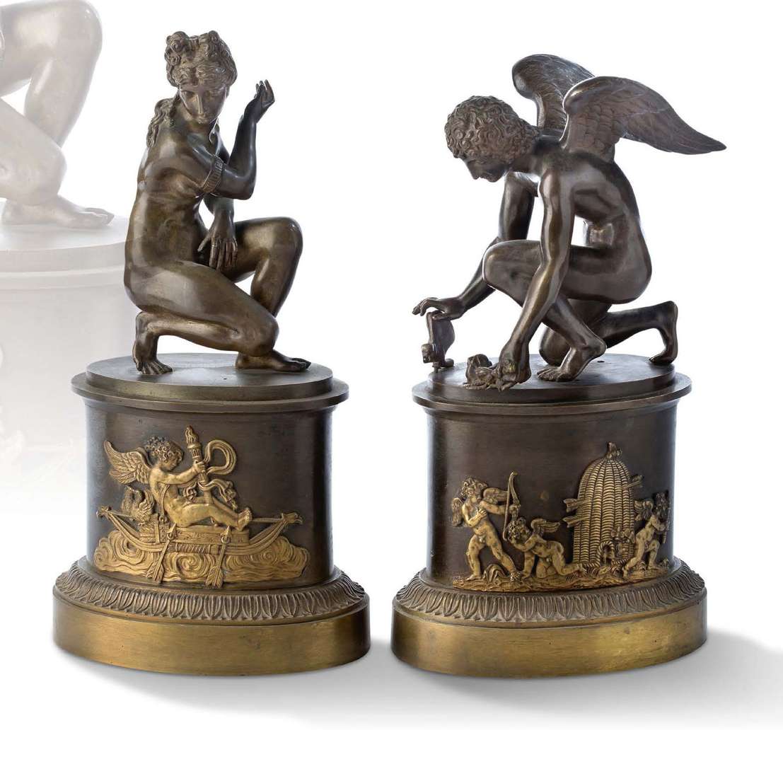 Deux sujets en bronze à patine brune formant paire. Reposent sur des bases de forme ovale recevant un décor en applique de scènes avec des putti.
