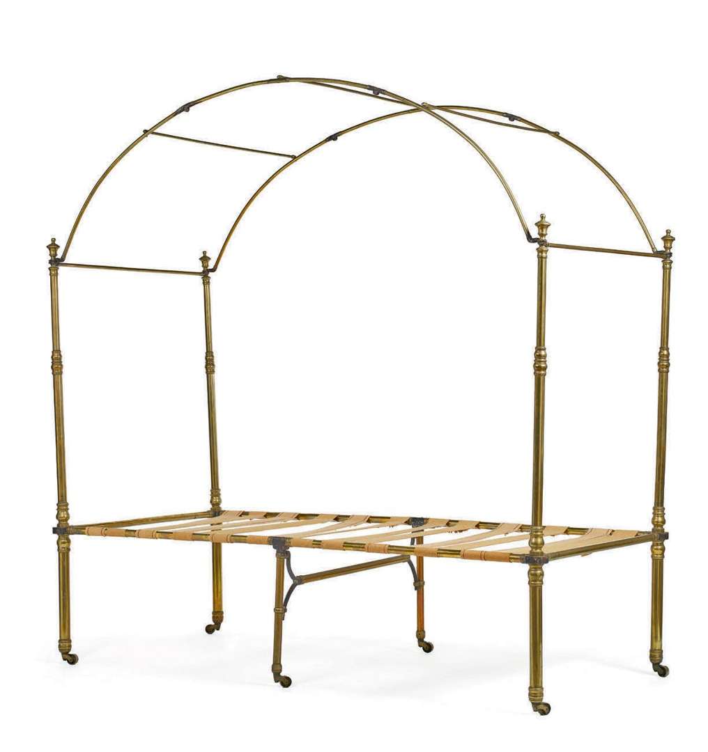 LIT D'OFFICIER en laiton doré et fer forgé sur six pieds à roulettes d'origine. Les montants à toupies reliés par un dais en berceau de fer forgé. Entièrement démontable.