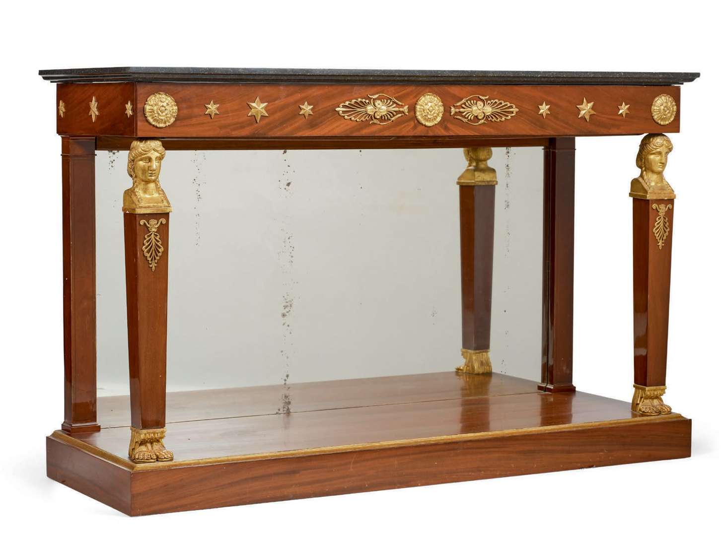 ~* CONSOLE EMPIRE RECTANGULAIRE à fond miroir en placage d'acajou et bois doré à l'imitation du bronze doré. La ceinture ornée de bois doré appliqué à motifs de rosaces, de palmettes et d'étoiles, ouvrant en façade par un tiroir à poussoir. Les montants antérieurs à l'effigie de bustes de Cariatides montés en gaine se terminant par des pieds dans des sandales.