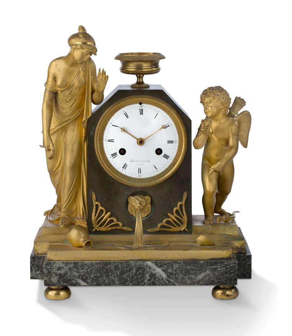 en bronze à deux patines : doré et vert antique. Cadran émaillé, mouvement à suspension à fil et sonnerie. Cadran signé «Lefevre sucr de De Belle à Paris».