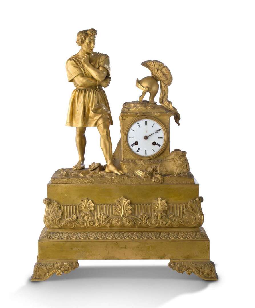 en bronze ciselé et doré représentant le gladiateur debout et tenant ses entraves, l'épée à la main, son casque est posé sur un autel dans lequel est inscrit le cadran émaillé blanc. La base rectangulaire ornée de frises de palmettes stylisées et de rinceaux feuillagés.