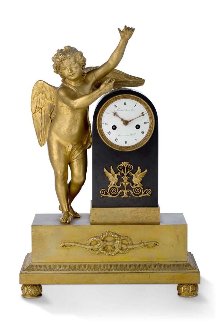 Pendule à l'Amour en marbre noir et bronze doré. Le cadran, s'insérant dans une borne, en émail blanc signé Thomire & Cie Paris et Moinet Ainé Horloger, présente les heures en chiffres romains. Ornementation en applique de palmettes sommées de colombes affrontées et de couronnes feuillagées traversées par un arc. La base de forme rectangulaire bordée d'une frise de palmettes.