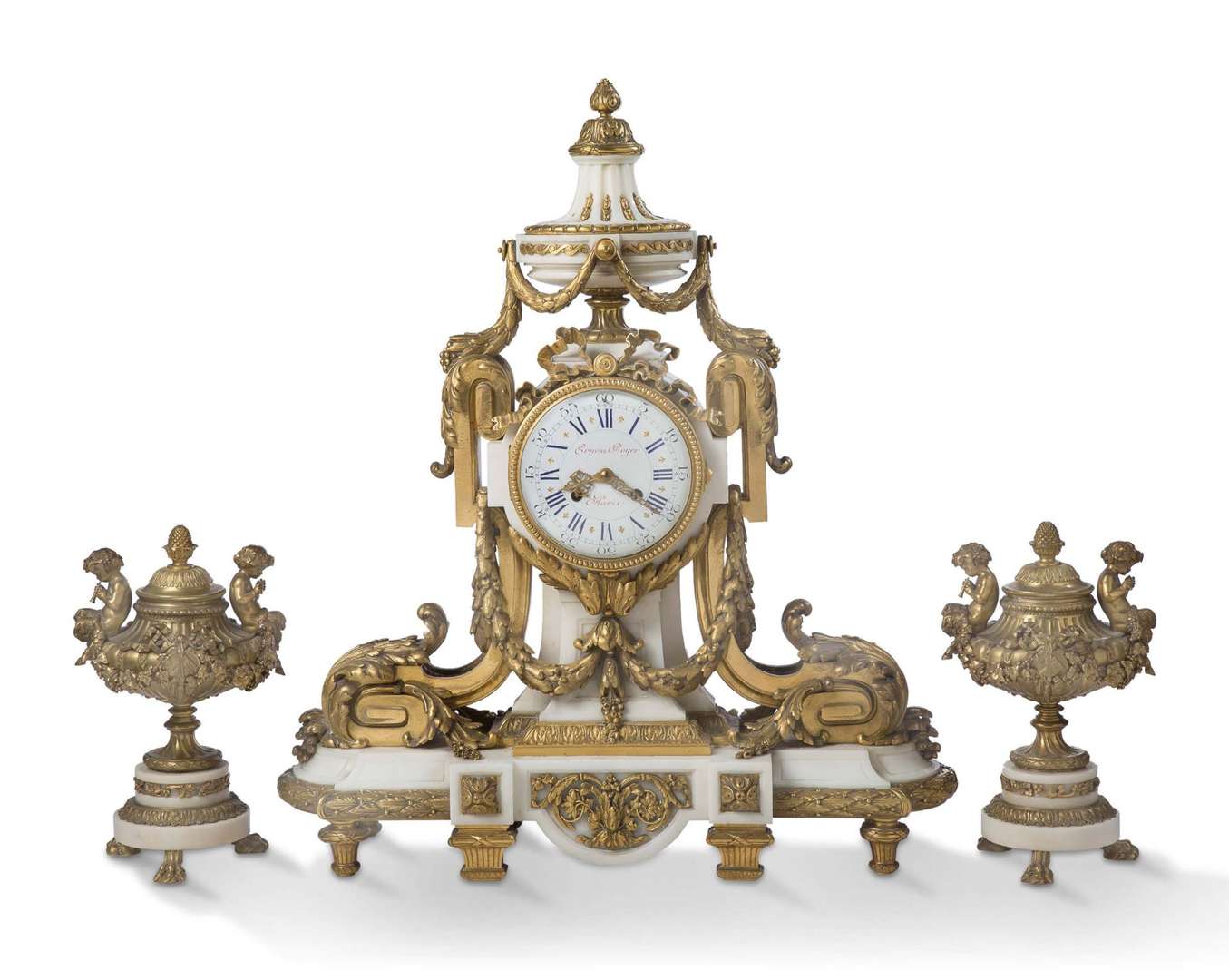 composée d'une pendule et de deux vases montés en cassolettes en marbre blanc et en bronze ciselé et doré.