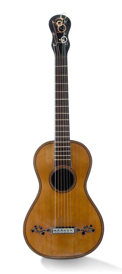 la caisse en érable et la table en épicéa d'un beau grain serré, filet de rosace et de caisse en chevron. Étiquette : «F. Breton breveté de S.A.R. Me la Duchesse d'Angoulême à Mirecourt 18(...)» Mirecourt, luthier Joseph-François Breton (1763 - 1837).