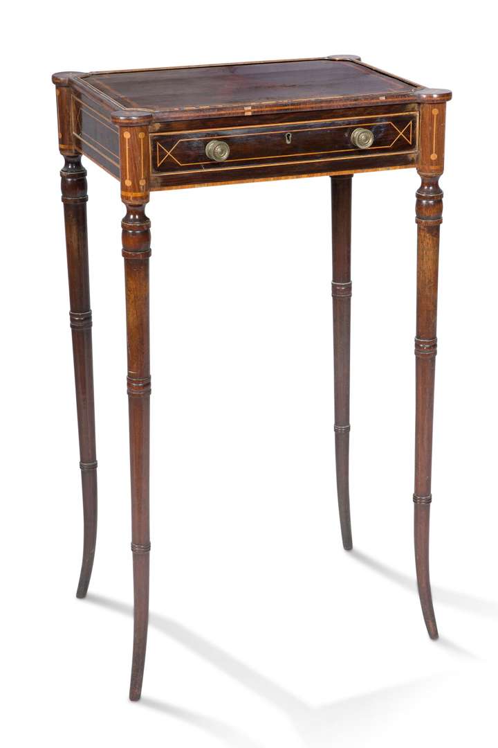 plaquée de bois précieux avec incrustation de bois clair en filets, elle ouvre par un tiroir en façade et une tablette d'ouvrage sur le côté. Décor marqueté de filets en relief, et d'étoiles. Repose sur des pieds galbés à annelets.