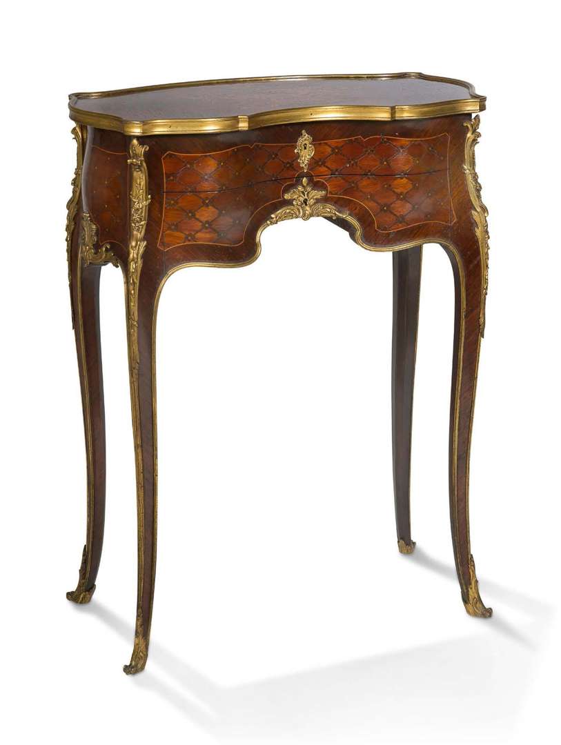 Table travailleuse entièrement marquetée de quadrillage à quartefeuille et panier fleuri.