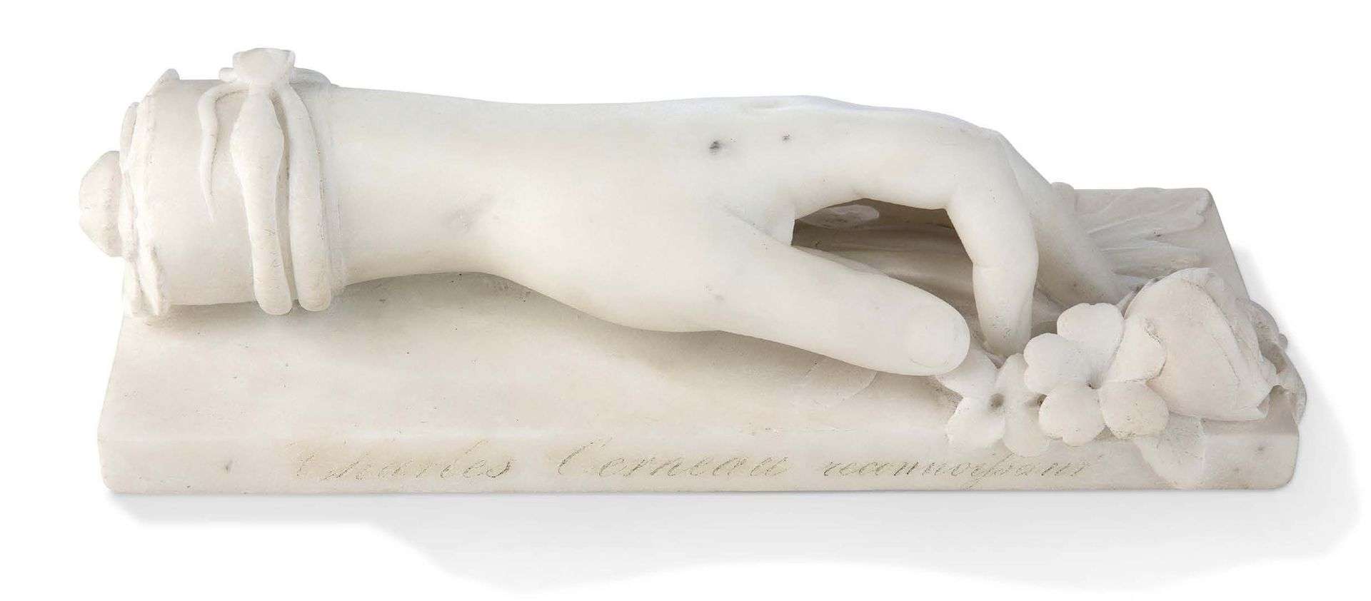 Main gauche de dame en marbre blanc sculpté. La main est parée d'un bracelet aux serpents affrontés serti d'une pierre précieuse, elle repose sur un petit bouquet de fleurs et est posée sur un entablement rectangulaire. À la coupure du poignet est une grande pivoine stylisée.