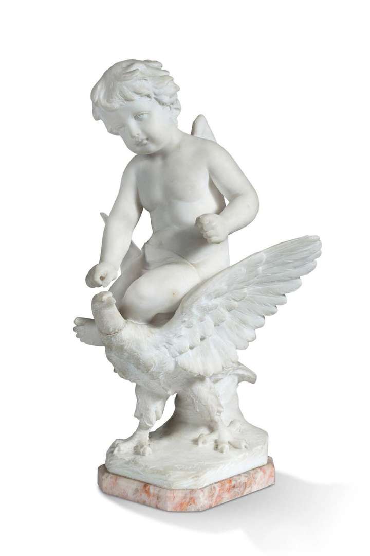 Statue en marbre blanc représentant un enfant ange assis sur le dos d'un oiseau.