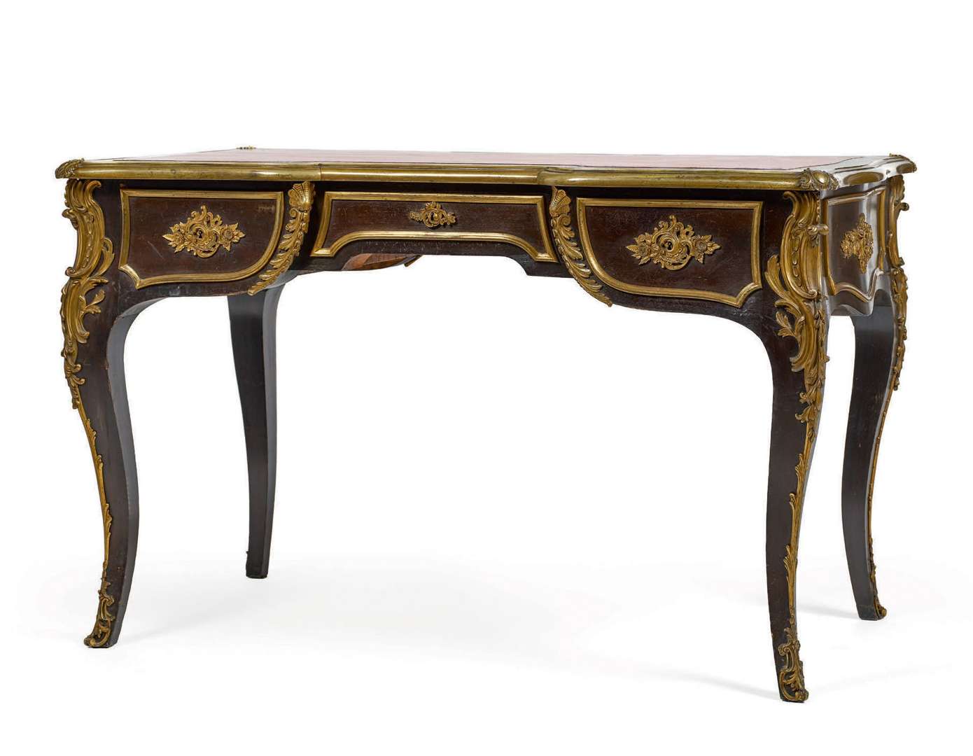 BUREAU PLAT de forme mouvementée en bois noirci. Il ouvre par trois tiroirs et repose sur quatre pieds cambrés. Dessus de cuir rouge doré aux petits fers. Bronzes dorés tels lingotière, poignées, entrées de serrure et chutes. Deux marques aux pochoirs de la Maison A. Kneib.