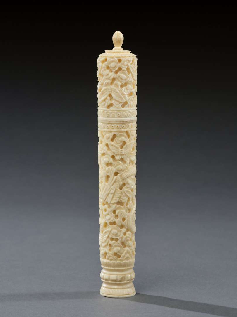 ˜ de forme cylindrique en ivoire à décor sculpté de dragons et volatiles dans les nuées.