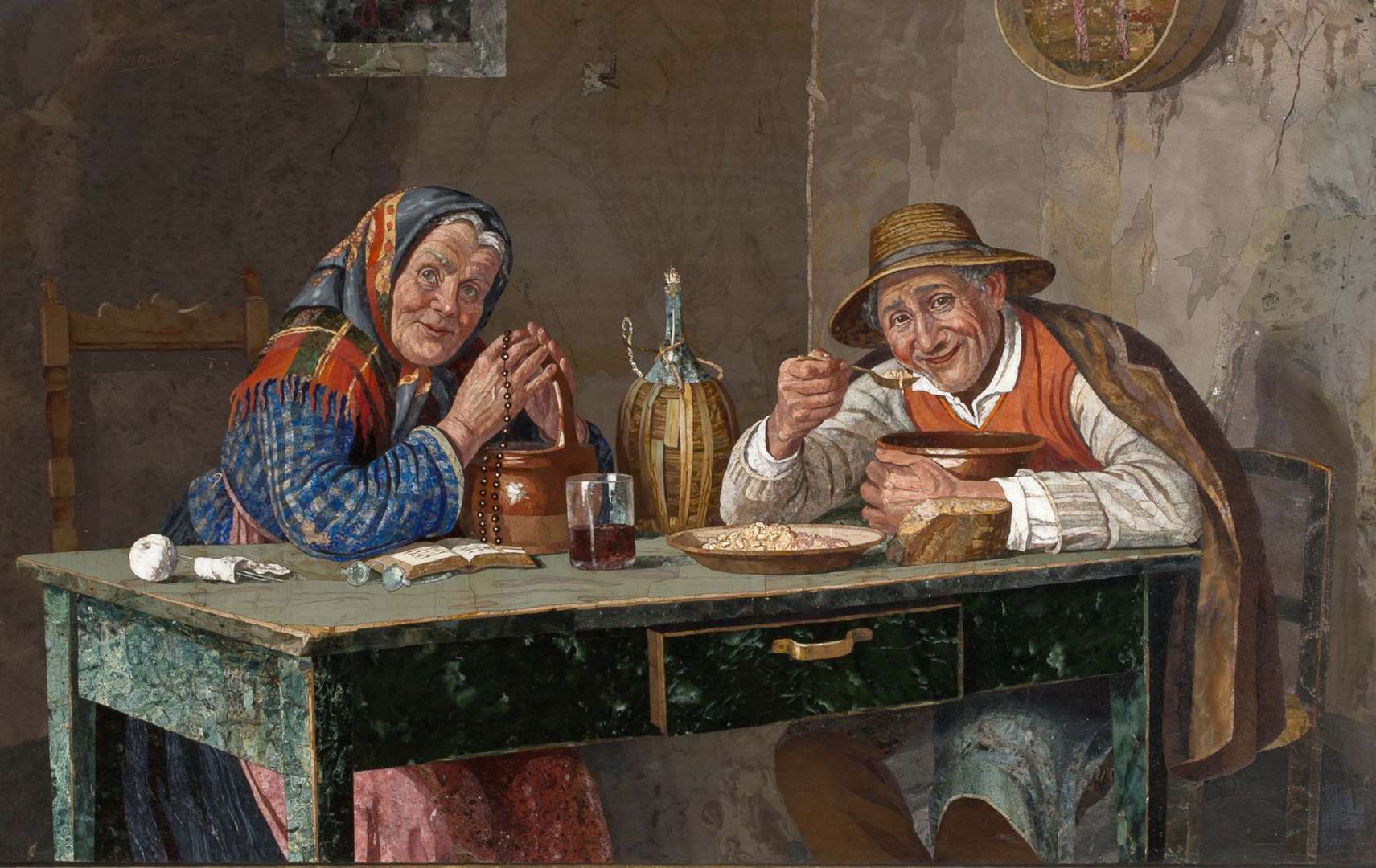 Tableau en marqueterie de pietra dura représentant un vieux couple attablé, Madame priant son chapelet et Monsieur déjeunant.