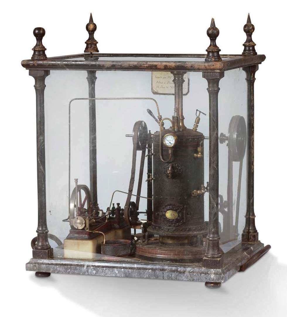 avec machine à vapeur et ustensiles miniatures. Dans une boîte en verre adaptée spécialement conçue sur une base de marbre et monture en bois peint.