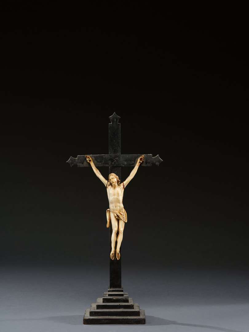 Sur une croix en bois d'épicéa sculpté et noirci.