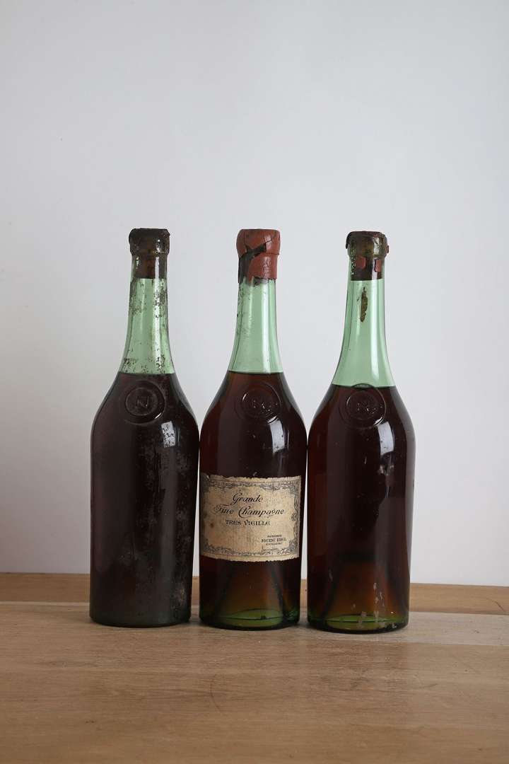 3 B COGNAC GRANDE FINE CHAMPAGNE TRÈS VIEILLE (2 à 7,5 et 1 à 8,2 cm| 1 e.a| 2 s.e| 1 capsule avec cire abimée| 2 quasi s.c.) - NM - René Niel