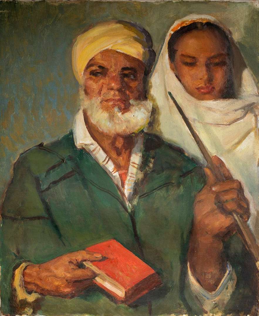Fumeur de narguilé et jeune Marocaine au voile blanc