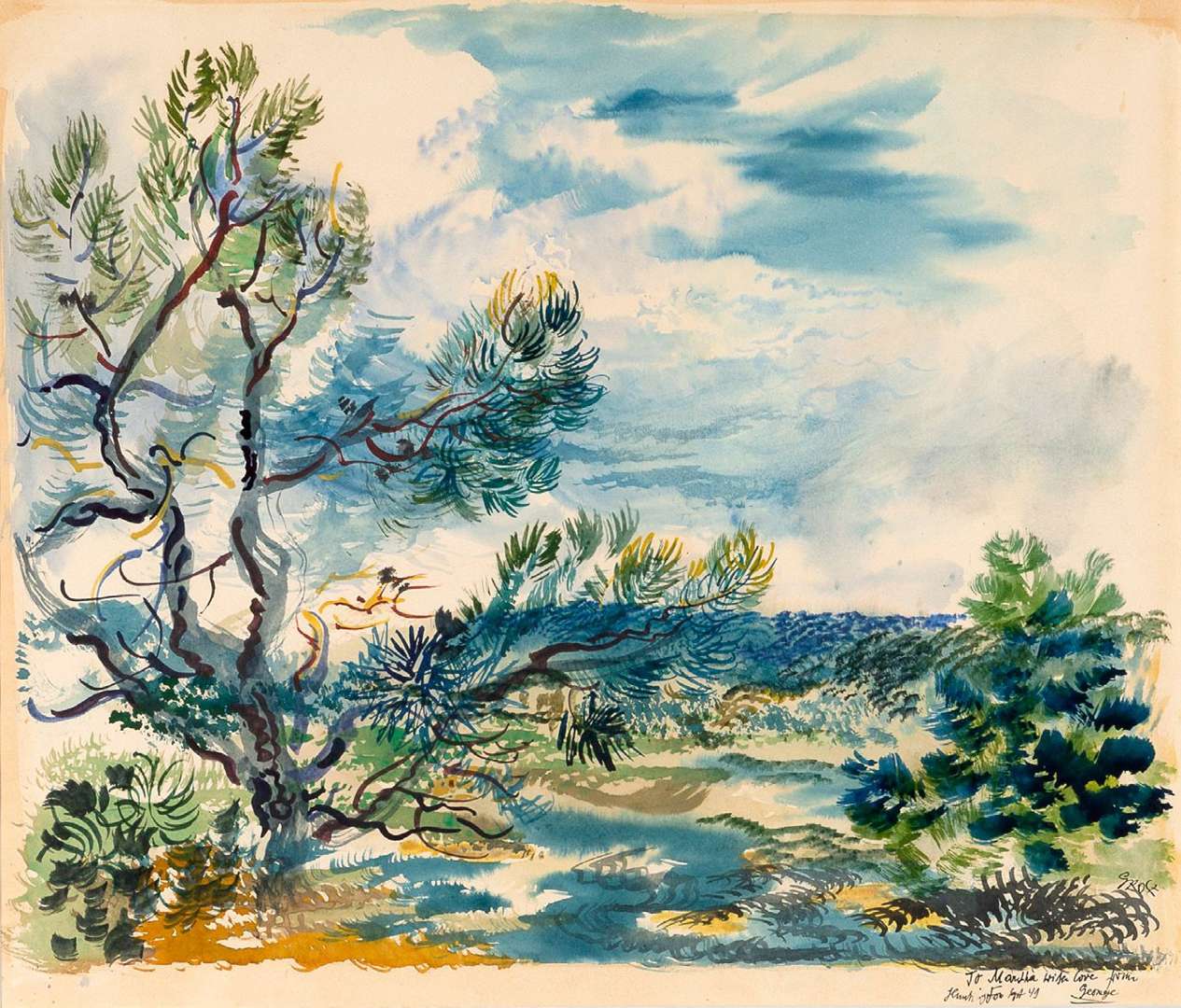 George Grosz (1893 - 1959), Cape Cod Landscape, aquarelle, stylo et encre sur papier, 50,8 x 35,6 cm, in. Vente, The Collection of Peggy and David Rockefeller: Fine Art, Day Sale, Christie's, New York, 10 mai 2018, lot 562